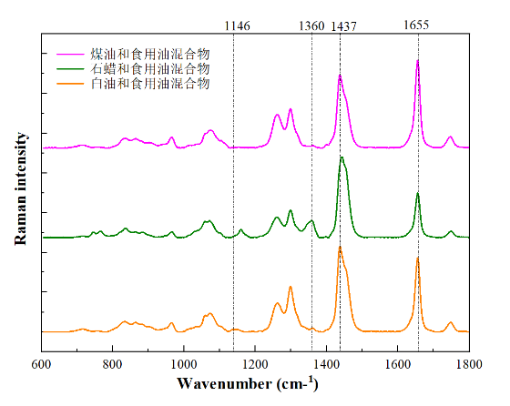 检测不同工业油与食用油混合物的拉曼光谱图如图2所示。在三种混合物中均发现了1655cm-1和1745cm-1峰位处的食用油拉曼特征峰,表明三种混合物中均有食用油掺杂。此外,1146 cm-1峰位的白油拉曼峰、1360 cm-1峰位的石蜡拉曼峰、1437cm-1峰位可与图1中的纯品油拉曼峰相指认,作为油混合物的识别依据。