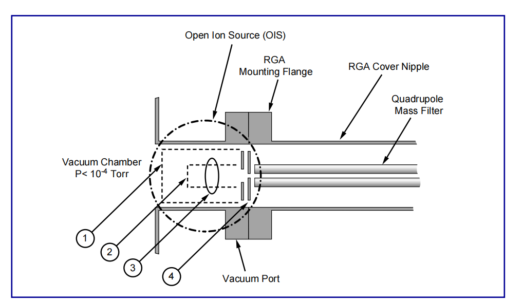 在大多数商用 RGAs 中使用的标准离子源是开放离子源(OIS)。这种电离器被认为是 RGA 的“全做”源。自 20 世纪 50 年代初以来,它就一直呈圆柱形,轴向对称的形式存在。通用的 OIS 设计原理图如图 1 所示。