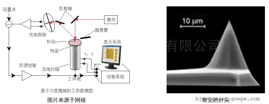 AFM 由一个对微弱力极敏感的弹性微悬臂(通常是氮化硼),在其尖端有一个用来在样品表面上扫描的很尖细的探针(针尖的下端通常只有几个纳米的尺寸),通过探测针尖与样品之间的相互作用力来获得表面拓扑图,以及其在物理参数(例如硬度、电荷密度)方面的评价。