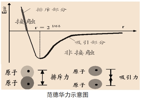 此作用力为原子间的排斥力或吸引力即范德华力(Van Der Waals Force),假设有两个原子,一个是在微悬臂的探针尖端,另一个是在样品的表面,它们之间的作用力会随着距离的变化而变化。 当原子和原子很接近时,彼此的电子云排斥力作用会大于原子核与电子云之间的吸引作用,其合力表现为排斥作用。反之,若两原子分开到一定距离时,其电子云的排斥作用小于彼此原子核与电子云之 间的吸引力作用,故其合力表现为吸引作用。在原子力显微镜系统中,该作用力随样品表面形态而变化,它会使微悬臂随之摆动。将一束激光照射在微悬臂的末端,当微悬臂摆动时,会使反射激光的位置改变而造成偏移量,用激光检测器记录此偏移量,同时将此信号传递给反馈系统,以利于系统做适当的调整,从而将样品表面特征以影像的方式显现出来。