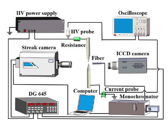 实验装置图如下图所示,放电电极由两根钨针组成,电极间隙控制在2mm,火花放电由纳秒脉冲电源驱动产生。利用DG645同步纳秒脉冲电源、条纹相机以及ICCD相机捕获火花放电超快击穿过程以及放电模式演化过程的图像,同时,利用DG645同步纳秒脉冲电源以及发射光谱仪完成对放电过程中产生的活性粒子的产生和淬灭过程的诊断。