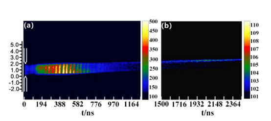 由于初始击穿过程和流光到火花阶段的转换过程通常在几纳秒的时间尺度内完成,ICCD相机难以捕捉到其中变化,因此需要使用分辨率更高的条纹相机,图3-4为条纹相机采集到的火花放电过程图像,采集的时间窗口分别设置为980ns(Δ t=9.8ns)以及10 ns(Δ t=9100 ps)。从图3中可以发现,在形成放电通道的初期,靠近负极的放电发光更强。而在形成放电通道之后,正极附近的放电更强一些。1500ns之后,火花放电通道熄灭,而在负极附近仍然可以观察到放电等离子体的余辉。