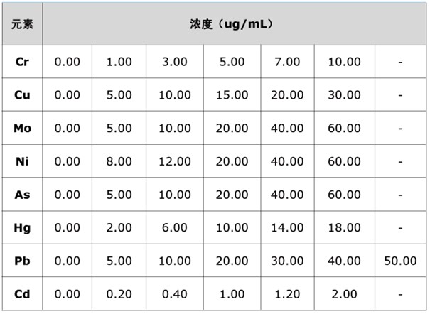 按下表配制各元素的系列标准溶液,待仪器工作稳定后,依次进样,根据浓度和吸光度,绘制标准曲线。