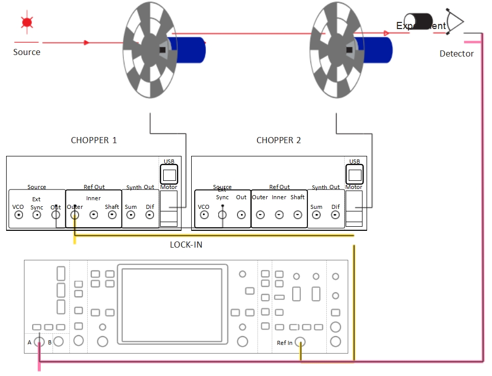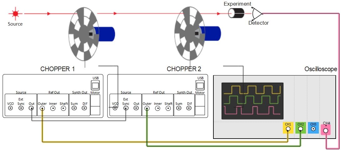 图4: .使用示波器对两个SR542光学斩波器进行同步和相位对准的示意图。斩波器1做为主时钟,因此其Source Output与斩波器2的Ext Sync Input相连。两个斩波器的Outer Slots Reference Output以及来自光电探测器的双斩波光束信号均连接到示波器上。