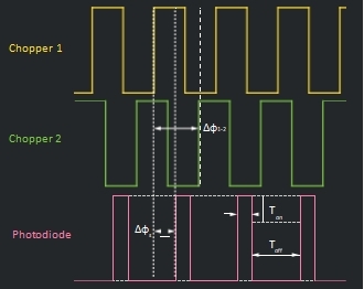同步两个光学斩波器,并调整其中一个叶片相对于另一个叶片的相位。