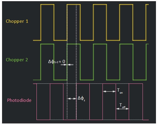 图 5: 模拟光束通过两个斩波器的示波器示意图。(a)在相位对齐之前,斩波器1和斩波器2的信号之间存在相位差φ12 ,光电探测器信号占空比(Ton /Toff )很可能为小于50%。(b)在相位对齐之后,光电探测器输出波形有50%的占空比。光探测器信号的相位差φs仍然存在。