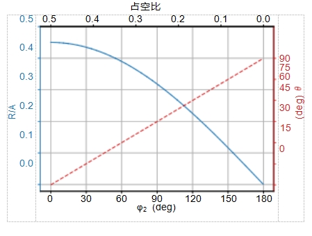 其中,的因子来自于锁相放大器的RMS计算。对于 0≤D < 0.5的计算结果如图8所示,其中自变量2为斩波器2的相位,用于调整占空比。