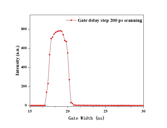 IsCMOS具有超快光学门宽,<3ns阴极光学门宽,内置精度<10ps门宽控制器。下图为门宽递进10ps扫描纳秒光源图谱。