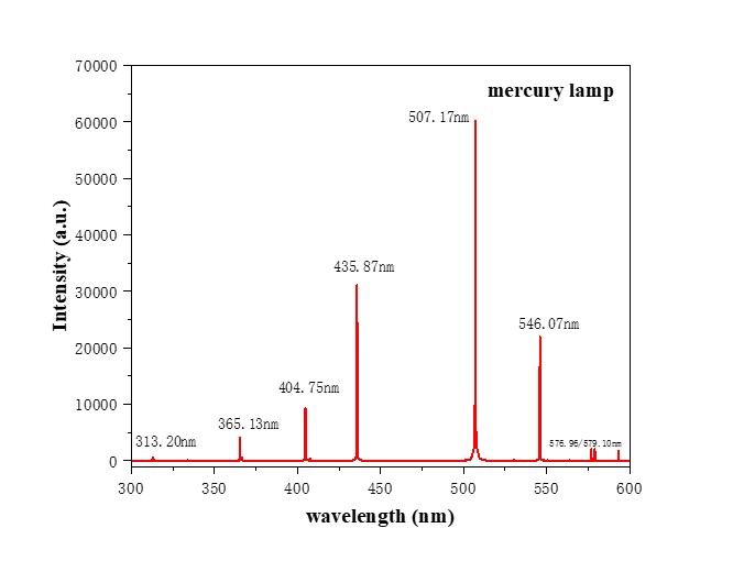 下图为IsCMOS配合卓立全新推出的Omni-λ300S光谱仪,在保证紫外高通光量的前提下,在@2400g/nm光栅时测试分辨率可达0.05nm。此外软件上优化了校正算法,多峰谱线波长校准,校准后汞灯各峰值精准度<±0.2nm @1200g/nm。