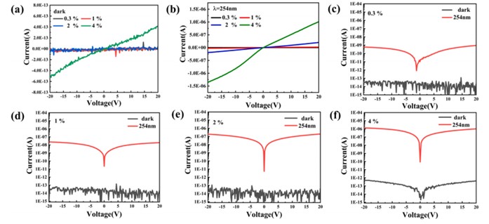 图1. 在(a)黑暗和(b)254纳米光照下,不同溶液中Si-Ga原子比例的样品显示出线性I-V特性。α-Ga2O3紫外探测器在黑暗和254纳米光照下的I-V特性:(c) 0.3%,(d) 1%,(e) 2%和(f) 4%硅掺杂α-Ga2O3。