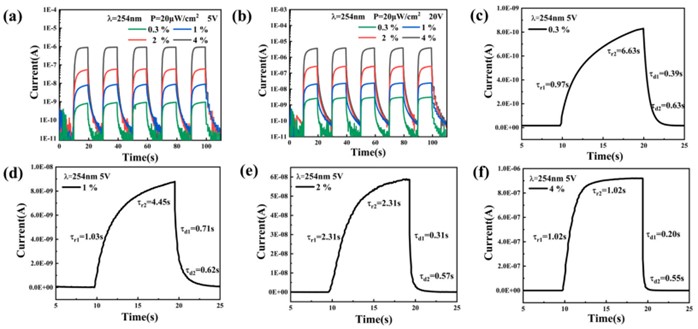 图2. 在254纳米和20微瓦/平方厘米光照射下,不同溶液中Si-Ga原子比例的α-Ga2O3:Si光电探测器在偏压(a) 5V和(b) 20V下的光响应的时间变化特性。在5V偏压下,254纳米、20微瓦/平方厘米光照中单周期内(c) 0.3%,(d) 1%,(e) 2%和(f) 4%的瞬态响应的放大。