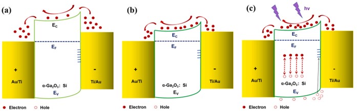 图3. MSM光电探测器载流子传输和能带示意图:(a) 低掺杂浓度在黑暗条件下,(b) 高掺杂浓度在黑暗条件下,以及 (c) 紫外光条件下。