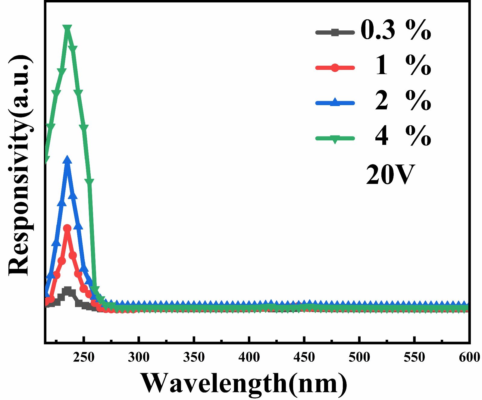 图4. α-Ga2O3光电探测器在不同Si/Ga原子比例下的光谱响应度。