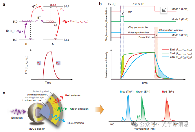 为了在单个纳米颗粒中实现单波长响应的全彩输出,研究人员构建了一种多层核壳(MLCS)纳米结构。将Yb/Tm对共掺杂到核心,Er/Tm/Yb共掺杂到外层发光壳层,中间生长一层光学惰性的NaYF外延层,以避免两层之间的光谱串扰,*外层再包覆一层NaYF壳层,防止表面猝灭效应。在该设计中,发现980nm连续波激发时,核心的蓝色发射会与外壳层的红色发射同时被激活。为解决这一问题,通过在发光壳层中增加Yb³含量,部分Yb³作为能量收集器,捕获入射的980nm激发光子,减少到达核心激活Tm³的激发能量,从而在连续波980nm激发下实现红色输出。在短脉冲980nm激发时,由于绿色发射上升时间快,能够产生绿色发射。利用时间选通技术,由于Tm³发射寿命比Er³长得多,可滤除短衰减的红色和绿色发射,实现蓝色发射输出。*终,在合适的激发模式下,实现了RGB颜色可调的发射,首次在单个MLCS纳米颗粒中通过单一980nm激光的激发模式调控实现了全彩输出。