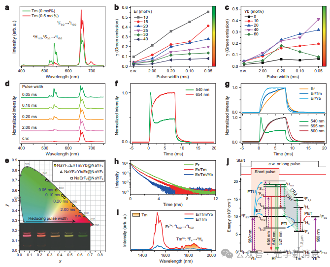 研究人员通过在传统的Er/Yb体系中引入少量Tm³,并通过Tm/Yb对的协同调制作用来调控Er³的上转换动力学。合成了一系列NaYF:Er/Tm/Yb@NaYF核壳纳米颗粒,研究发现其发射颜色与各镧系掺杂离子的浓度密切相关。通过精确调节980nm激发激光的脉冲宽度,能够实现发射颜色的连续变化。在连续波或长脉冲(如脉冲宽度大于8ms)激发下,样品呈现红色;随着脉冲宽度减小至0.05ms,发射颜色逐渐从红色变为橙色、黄色,*终变为绿色。而其他激发波长(如808nm或1530nm)则无法引发这种颜色变化。深入研究其发光机制,发现绿色发射的上升时间比红色发射更快,这是因为绿色上转换基于Yb³到Er³的共振能量转移和直接的上转换过程,而红色上转换的中间态需要通过Tm³介导的能量转移循环(ETL)过程或多声子弛豫(MPR)来填充,导致时间延迟。同时,实验观察到当脉冲持续时间超过约0.5ms时,Er³的发射曲线会出现突然下降,这是由于Tm³和Yb³的协同作用引发的交叉弛豫(CR)过程,该过程发生在Er³的绿色发射能级和Tm³的中间能级之间,导致绿色发射寿命缩短。