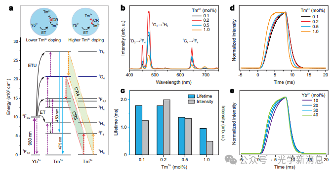 图3. 调控Tm³蓝色上转换的上升和衰减时间 a Yb/Tm耦合体系中Tm³蓝色上转换示意图以及可能导致发射猝灭的交叉弛豫(CR)过程。CR3和CR4分别代表[G;³H]→[³F;³F]和[D;³H]→[G;³F]的交叉弛豫过程。插图对比了低、高Tm³掺杂情况下有、无交叉弛豫时的离子相互作用。 b 980nm激发下,NaYF:Yb/Tm(20/0.1 - 1.0 mol%)@NaYF核壳纳米颗粒的上转换发射光谱。 c (b)中样品在475nm处的发射强度和寿命随Tm³掺杂浓度的变化关系。 d、e (b)中样品以及NaYF:Yb/Tm(10 - 40/0.1 mol%)@NaYF核壳纳米颗粒在脉冲宽度为8ms的980nm脉冲激发下,Tm³在475nm处的时间相关上转换发射谱。