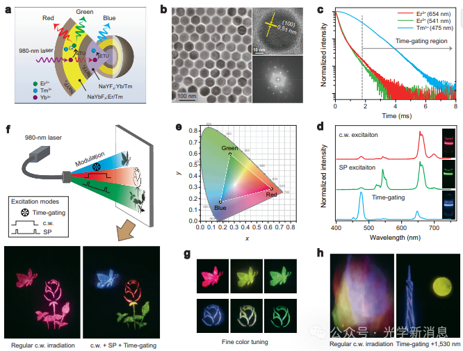 镧系发光材料在众多领域展现出巨大潜力,可将红外光转换为可见光,在激光、显示、纳米成像和生物光子学等方面应用广泛。然而,实现单波长激发下的全彩可切换输出一直是困扰科研人员的难题。传统的上转换和发光材料,在确定了掺杂离子和组成成分后,通常只能呈现出特定的发射颜色,无法满足对发光颜色多样化和动态调控的需求。上转换过程是一种非线性反斯托克斯过程,从较低能级激发到发射能级需要一定时间,这使得上转换发射具有特征性的上升时间,这为调控发射颜色提供了新的参数。结合时间选通技术,通过合理调制上转换上升时间和筛选长衰减发射,有可能实现单波长激发下从单个纳米颗粒产生全彩可切换输出,为解决上述问题提供了新的研究方向。