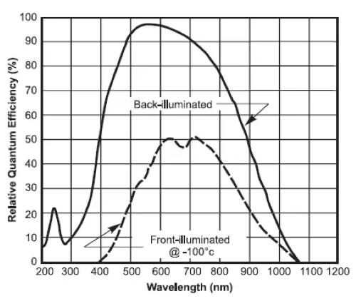 CCD按受光方式可分为前感光和背感光两种。前感光 CCD 由于正面布置着很多电极,光经电极反射和散射,不仅使得响应度大大降低(量子效率通常低于 50%),也因为多次反射产品的干涉效应使光谱响应曲线出现马鞍形的起伏 ;背感光 CCD 由于避免了上述问题,因而响应度大大提高,量子效率可达到 80% 以上。(如图示)