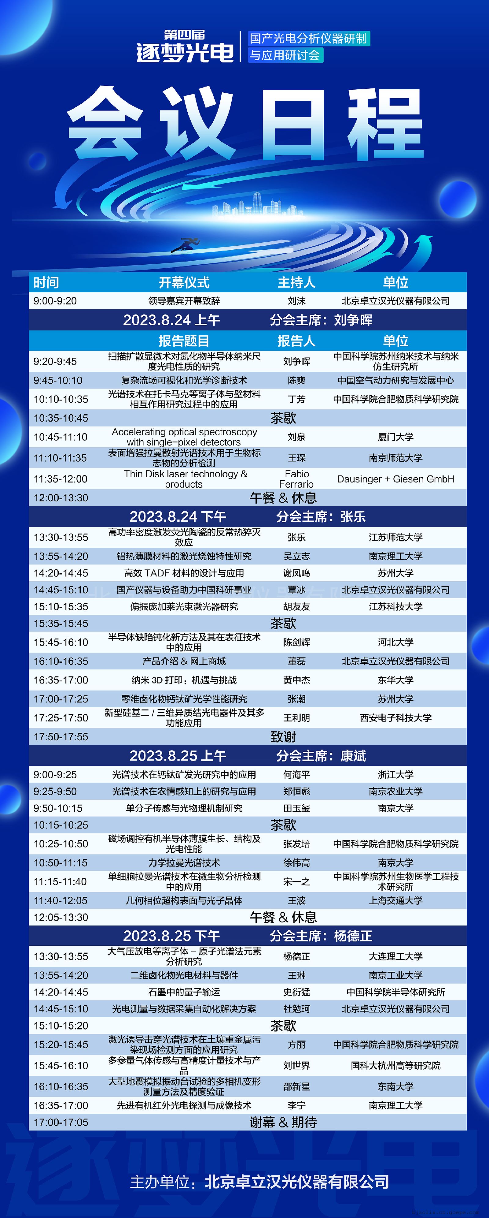 作为从事光电分析测试仪器和精密光学机械运动控制产品研发与生产的国家高新技术企业,秉持 “研发创新、快速反应、优质服务”的理念,为响应国家整体布局,更好地为科学研究提供技术服务,北京卓立汉光仪器有限公司将于2023年8月24-25日在南京举行第四届“逐梦光电”国产分析仪器研制与应用研讨会,邀请来自全国各地“政、用、产、学、研”不同领域的专家学者们,齐聚六朝古都,畅谈光电行业前景、交流前沿的科研动向,分享仪器使用心得。