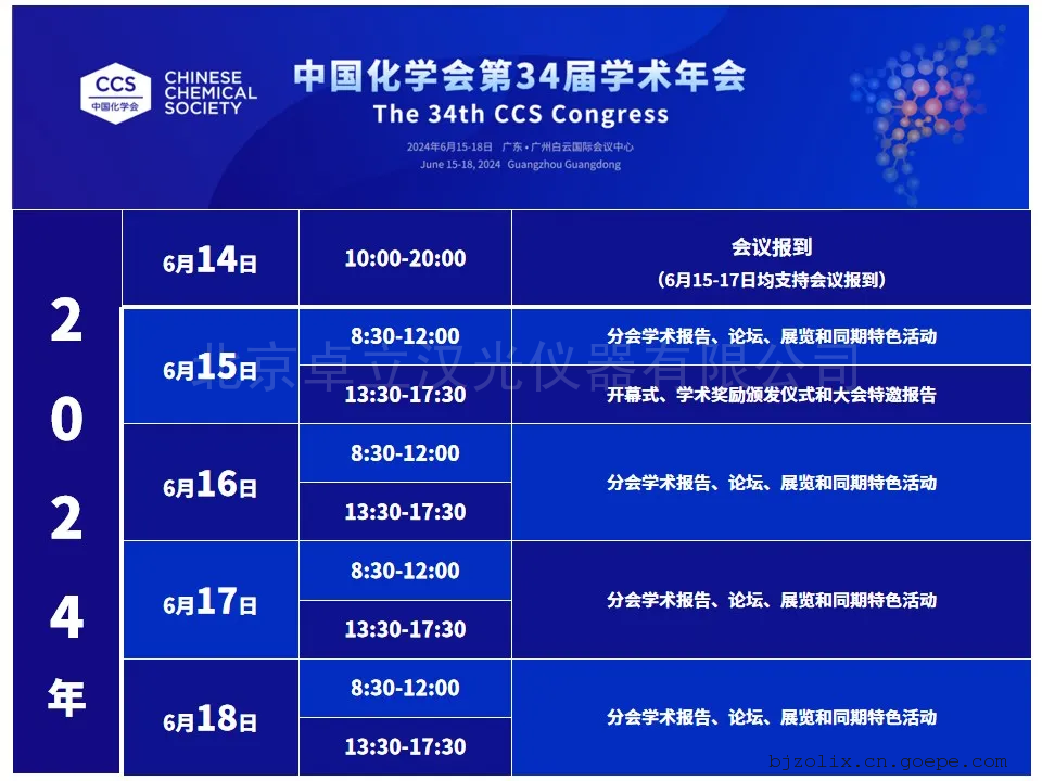 中国化学会第34届学术年会将于2024年6月15日至18日在广东省广州市召开。届时,卓立汉光将携带产品及解决方案亮相,期待与您相约在此(展位号:C20),共同探讨学术前沿!