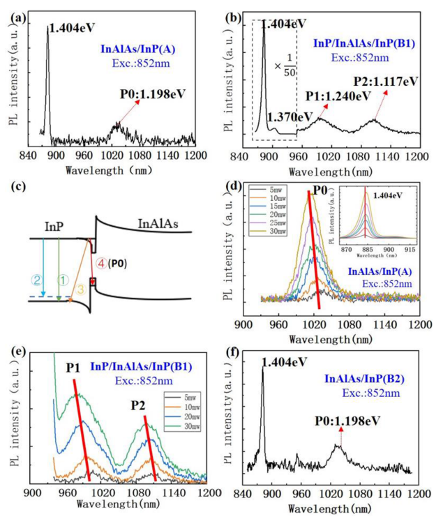 图1.(a) 单异质结构InAlAs/InP(样品A)和 (b) 双异质结构InP/InAlAs/InP(样品B1)在77 K下被852 nm激光器(5 mW)激发的光致发光(PL)光谱。(c) 直接界面的混合型I-II(InAlAs-InAs-InP)异质结构的能带结构。(d) 和 (e) 分别为样品A中P0以及样品B1中P1和P2的功率依赖性PL光谱(5–30 mW)。图(d)中的插图显示了1.404 eV峰值的功率依赖性PL光谱(5–30 mW)。(f) 没有InP的双异质结构InP/InAlAs/InP(样品B2)在77 K下被852 nm激光器(5 mW)激发的PL光谱。