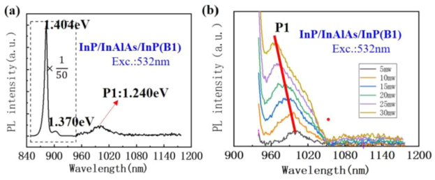 图2. (a) 由532纳米激光器(5毫瓦)激发的InP/InAlAs/InP(样品B1)的光致发光(PL)光谱。(b) P1随着激发功率从5到30毫瓦变化时的演变。