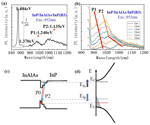 图3. (a) 具有200纳米厚的InP盖层的InP/InAlAs/InP(样品B3)在77 K下由852纳米激光器(5毫瓦)激发的光致发光(PL)光谱。(b) 样品B3的PL光谱随着激发强度(5至30毫瓦)变化的演变。(c) 反向界面的能带结构。(d) 界面激发注入空穴时,通过带尾填充效应调节能量的局域载流子复合发光的示意图。