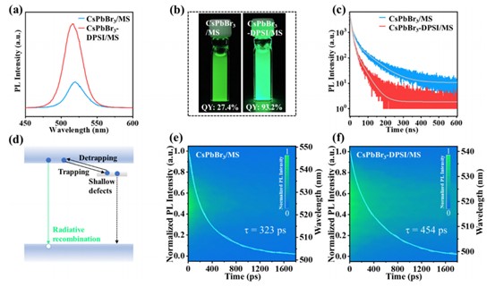 以上图中可见,CsPbBr3-DPSI/MS复合材料的荧光量子产率提高到了93.2%。在405nm的飞秒激光激发下,条纹相机获取得到的图像表明,CsPbBr3-DPSI/MS平均寿命从323ps(钝化前)增加到454ps,这也证实了DPSI在钙钛矿量子点表面的有效钝化作用。