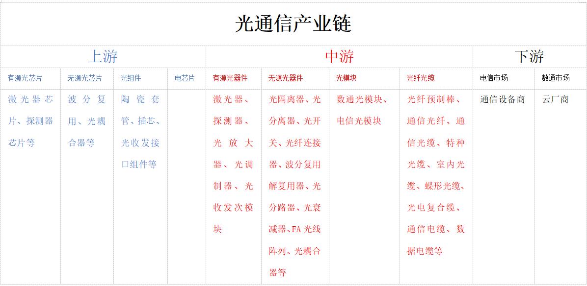 光通信产业链分上中下游,上游主要是核心零部件环节包括光芯片、光组件、电芯片,中游包括光器件、光模块和光纤光缆,下游按应用场景分为电信市场和数通市场。