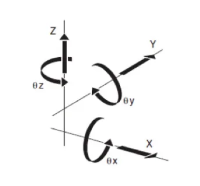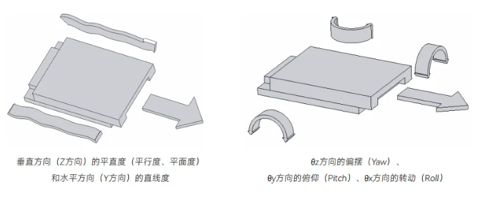 非轴向角度误差有三个相互垂直的分量,分别是 :θz 方向的偏摆(Yaw)、θy 方向的俯仰(Pitch)和 θx 方向的转动(Roll)。