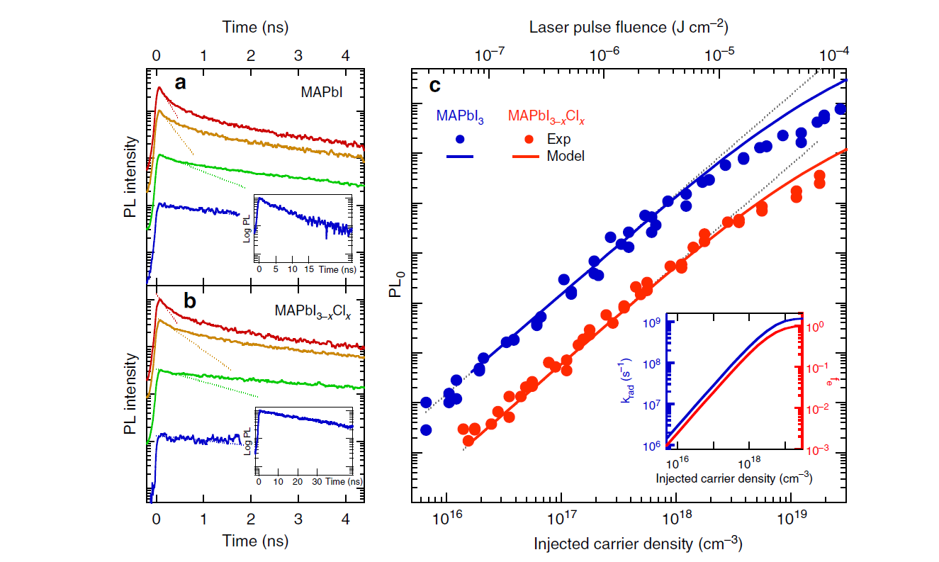 。从图3中可见,对于钙钛矿体系,在低激发浓度时,t=0时荧光强度与功率密度成平方关系,而在高强度时,接近线性关系,其反映的是激发态由自由电子空穴向激子态的过渡。因此,钙钛矿(以及其他任何光电半导体)中,其激发态类型不是一成不变的,而是和激发浓度紧密相关的。其中在一定激发浓度范围内,自由电子空穴和激子的比例可由Saha关系式来推导:其中ne,nh, nX分别为电子,空穴及激子的浓度。X为激子的有效质量,Eb为激子束缚能,kB和h分别为玻尔兹曼和普朗克常量。当然,实际半导体材料中,缺陷态以及高浓度下电荷屏蔽效应的可能同样会影响到激发浓度相关的荧光强度。