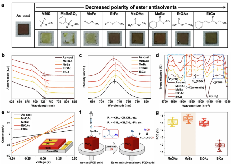 图1: PQD固体薄膜配体交换的高效酯类反溶剂甄选。