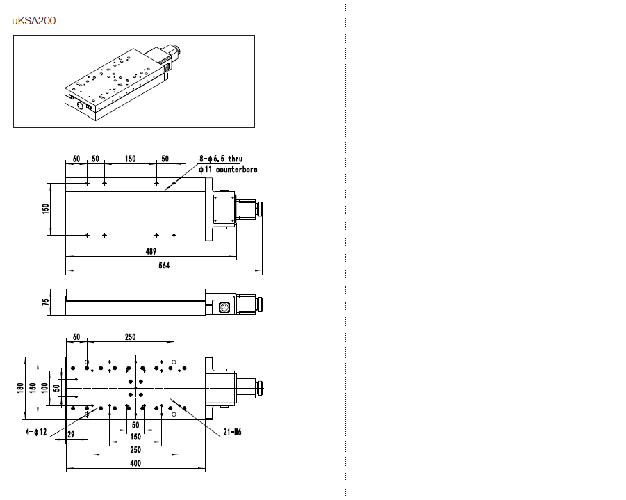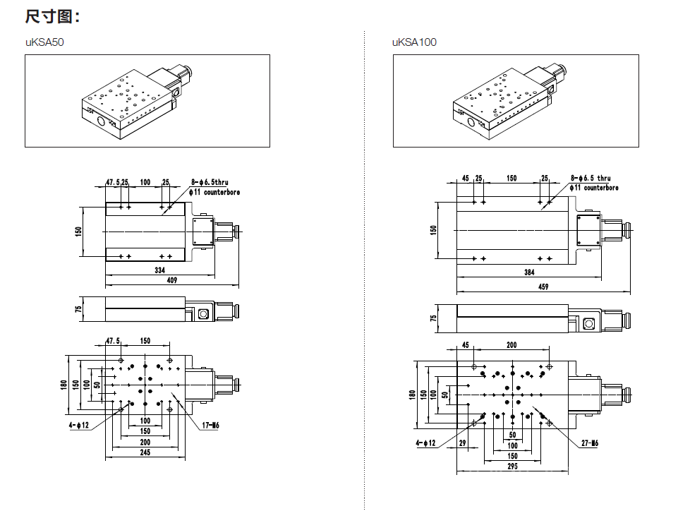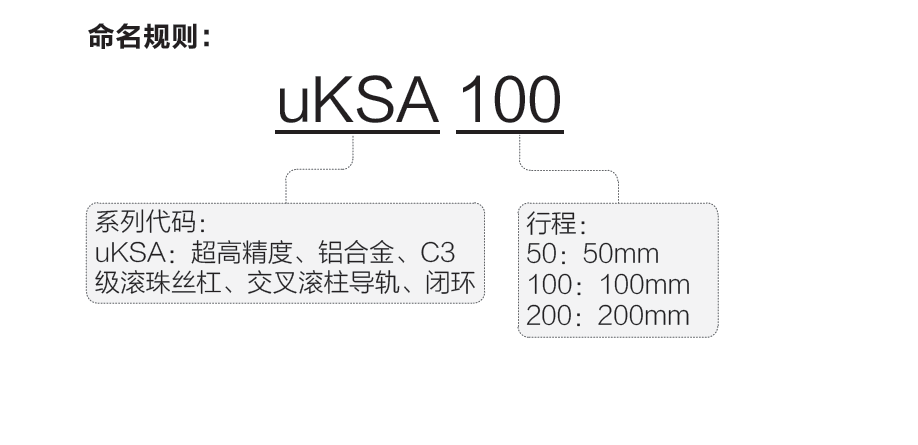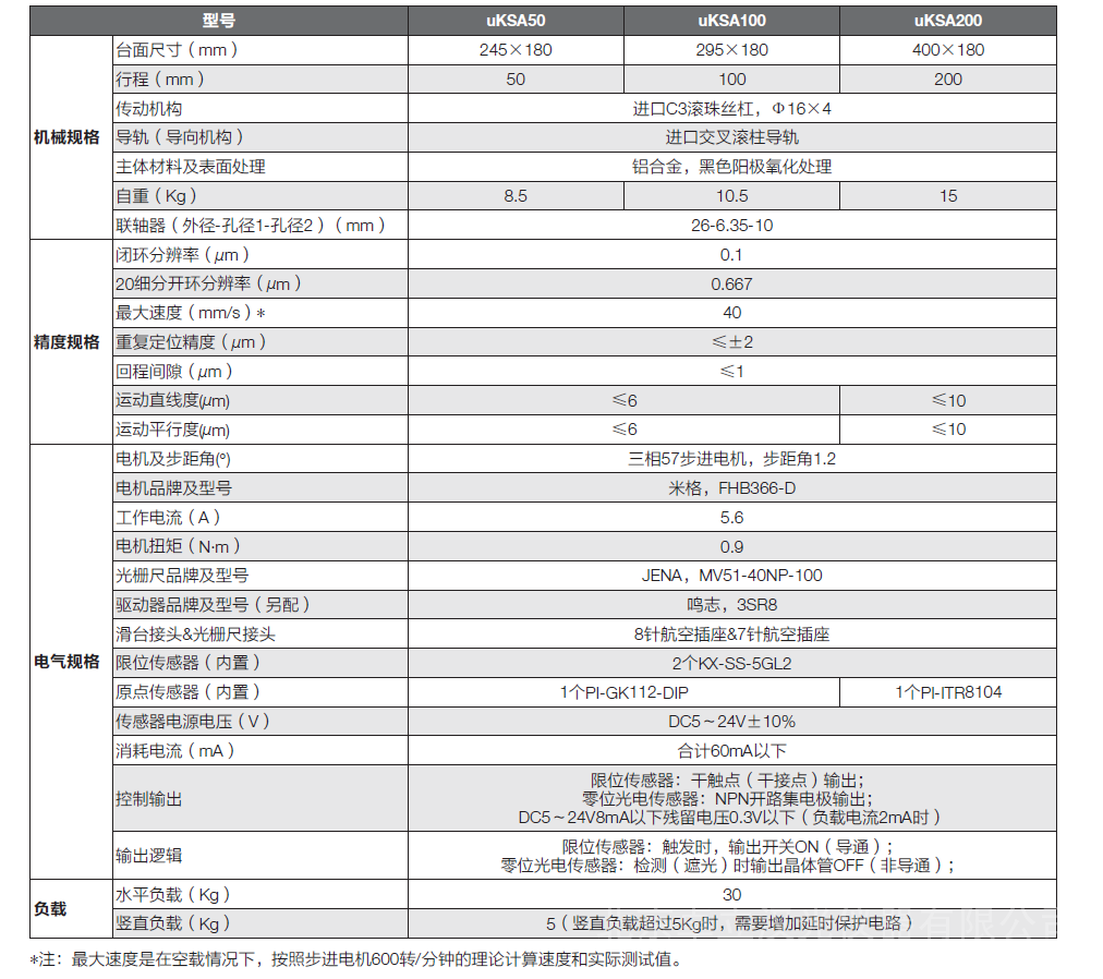 uKSA 系列超高精密电动直线滑台是卓立汉光开发的电动滑台产品,该系列产品采用进口滚珠丝杠和交叉滚柱导轨,内置进口光栅尺实现闭环分辨率0.1μm,其运动精度达到国际水平。该系列产品按行程分为50、100、200mm 等三款产品,配合卓立汉光的MC6003P 或TMC-USB 系列控制器,定位于超高精度要求的领域,如:超精密激光加工、超精密三维扫描测量等。