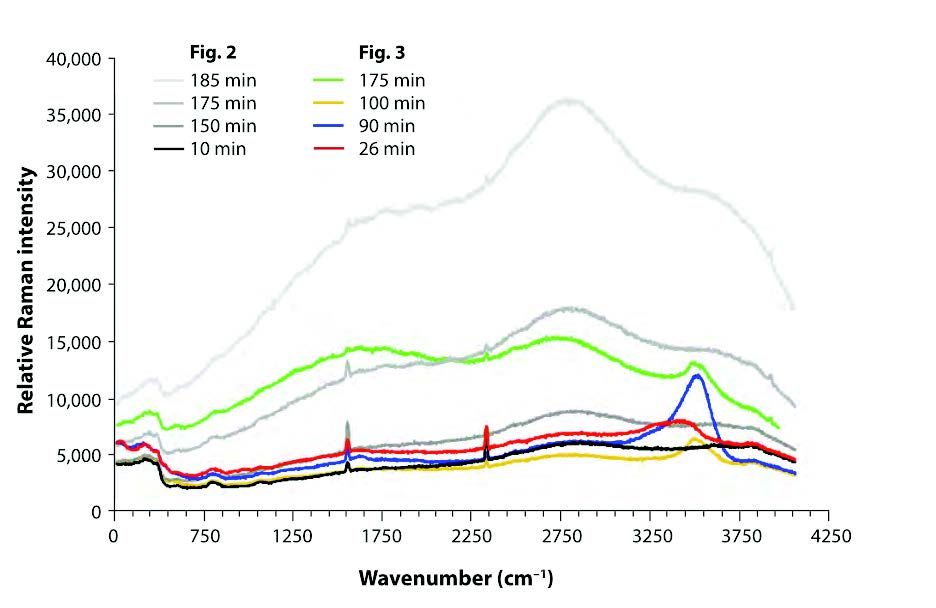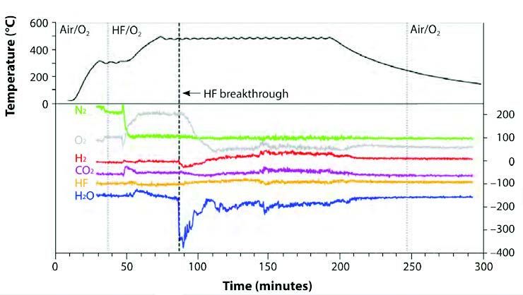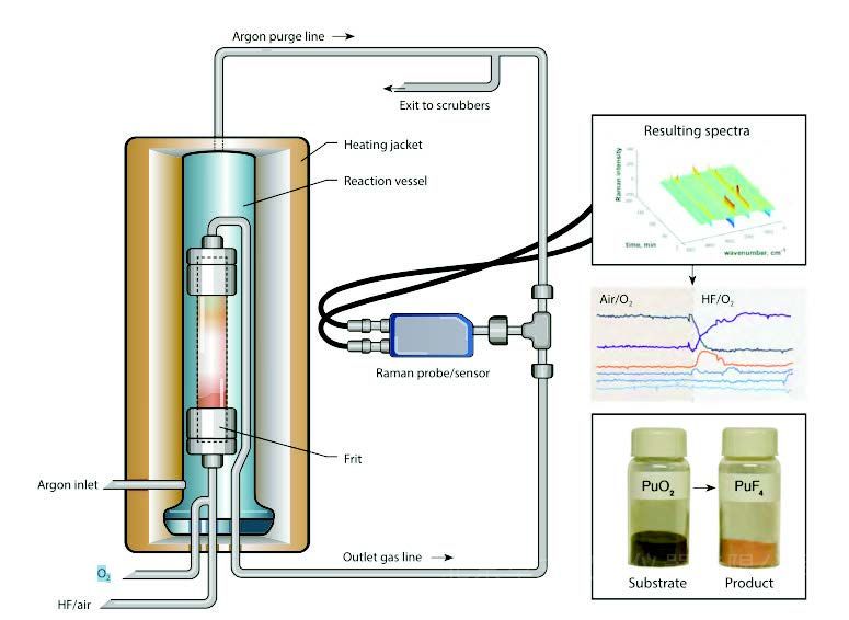Casella A [1] 采用特种探头拉曼技术对二氧化钚废气流动进行在线监测,用于评估制备铀、钚等高纯金属时的氟化反应进程。目前公认的氟化反应使用具有毒性和腐蚀性的HF,很大程度限制了探针和接口材料的选择。下图为实时监测氟化反应废气装置示意图,采用光纤探头拉曼,激光通过阻挡HF 气体的透明窗口聚焦监测。此外该系统可以用于监测其它反应产物和环境中的气体等。图 反应气体的拉曼光谱强度- 时间关系图和热刨面图