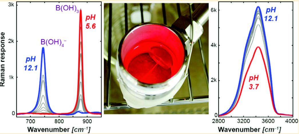 图 实验装置(中)和溶液pH 值、硼酸浓度的拉曼光谱图(左、右)