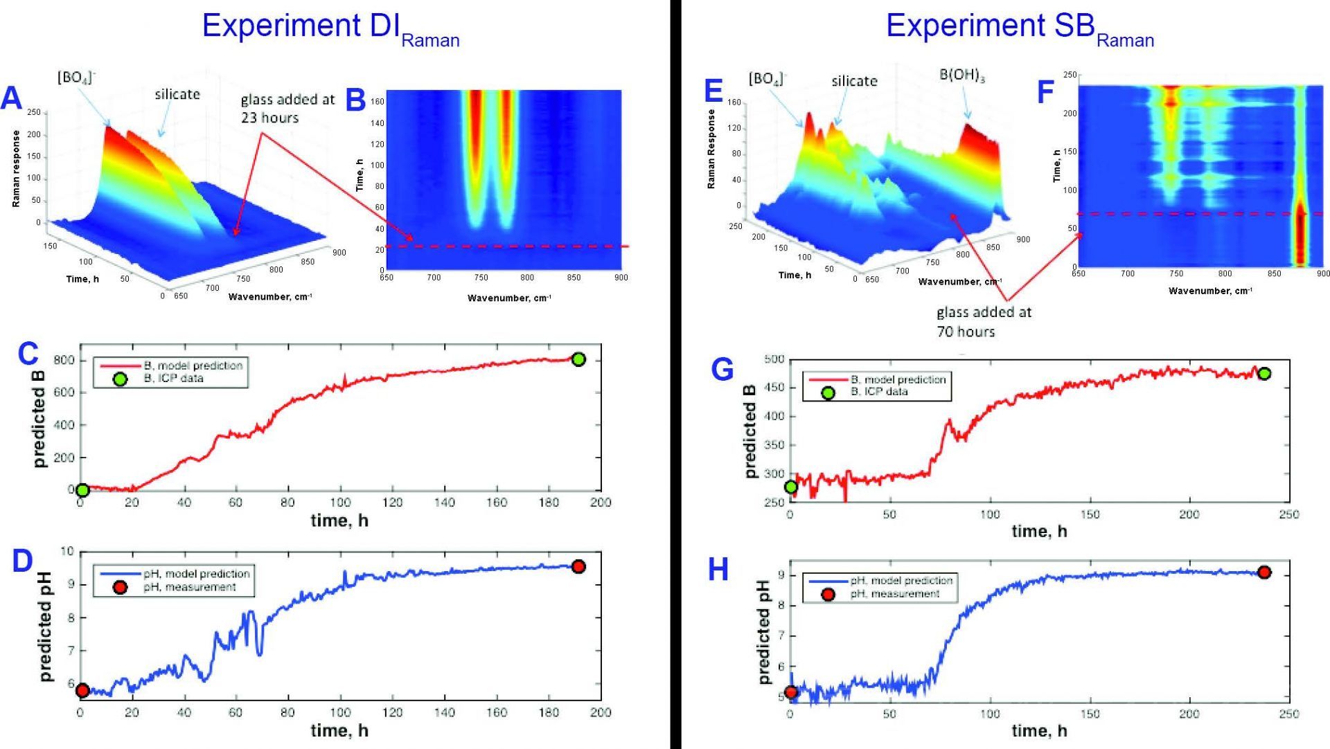 图 拉曼光谱模型图,DI(超纯水溶剂,A-D)SB(加硼酸盐溶剂,E-H),A,B,E,F 是拉曼光谱与时间三维图;