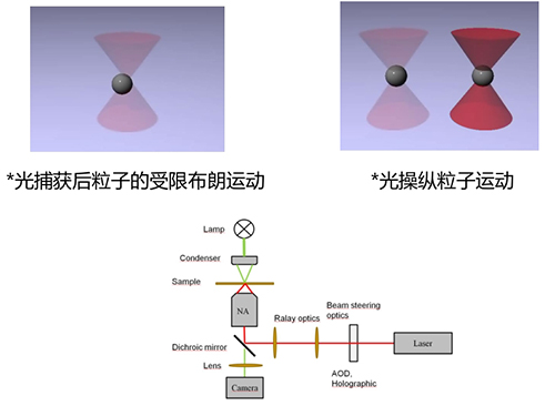 光镊原理:采用 100kHz AOD(声光偏转器)高速分时扫描不同位置,从而形成多个光阱;
