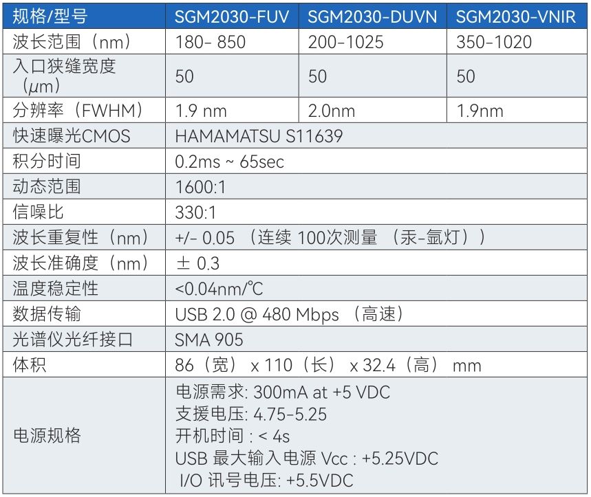 SGM2030 系列微型光谱仪是针对一般紫外光、 可见光和近红外测量应用的微型光谱仪。此款高性能光谱仪覆盖了 180-1025nm 的波长范围,其尺寸只有手掌大小,并可与光源、比色皿及其他附件相配套使用,非常方便各种系统整合。 在光谱量测上,其光学架构保障了测量的稳定性,尤其是在分辨率及波长飘移上有优异的温湿度、震动、与撞击稳定性。
