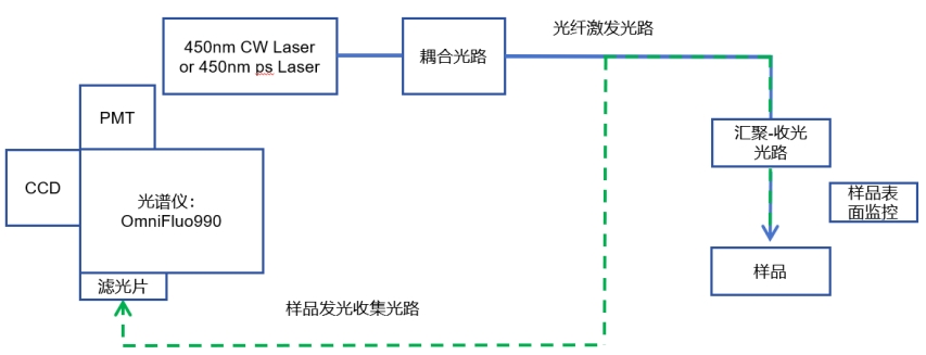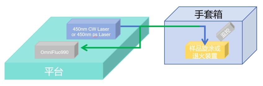 品牌:zolix 型号:- 加工定制:是 手套箱原位光谱测量方案半导体显微激射荧光系统近些年来,钙钛矿材料被广泛应用于光伏或发光。但由于钙钛矿材料对水分和氧气非常敏感,在制备和处理钙钛矿电池的过程中,通常需要在惰性气体(如氮气或氩气)环境下进行,以避免材料的降解。手套箱是一个封闭的操作空间,内部可以充满惰性气体,避免外界空气和水分的进入。这对于钙钛矿电池的材料合成、器件组装和测试非常关键,确保了材料的纯净度和实验结果的可靠性。在研究和开发钙钛矿器件的实验室中,手套箱通常用于材料合成、薄膜沉积、电池组装、封装和光电性能测试等步骤。它能够确保这些过程在无水无氧的环境中进行,从而提高电池的效率和稳定性。本文推出一种解决材料/器件在手套箱内进行PL测试的原位光谱测量方案。我们使用Y型光纤的耦合方式,将激光通过光纤一端耦合到手套箱中样品的旋涂或者退火装置进行激发,荧光信号原光路返回再去到Y型光纤的另外一个输出口,耦合进光谱仪。采用此耦合方式,我们可以将激发源和光谱仪放置在手套箱外,不占用手套箱内部空间,并实现稳态光谱、荧光寿命的原位PL测量。