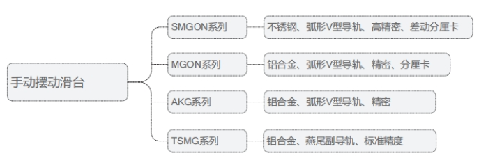 手动摆动台是空间轴进行俯仰 / 偏摆 (θx/θy) 调 节的手动滑台,根据内部结构和导轨不同,可分为多 种类型,但由于弧形导轨的加工和使用要求都比较高 所以国内很少有高精度的角位移台。卓立汉光的手动 摆动滑台,导向方式涵盖弧形交叉滚柱导轨、弧形 V 型滚珠导轨,燕尾副导轨。