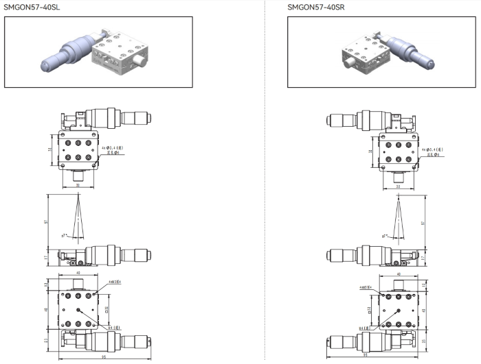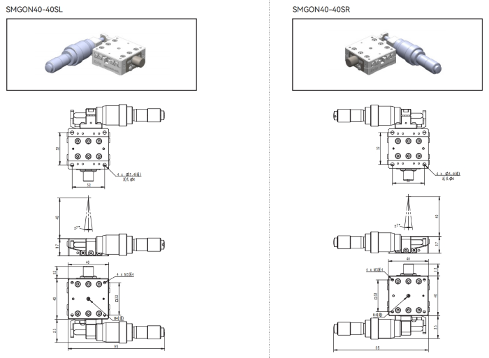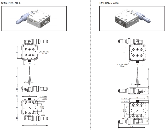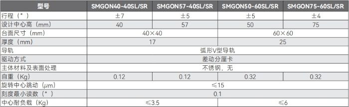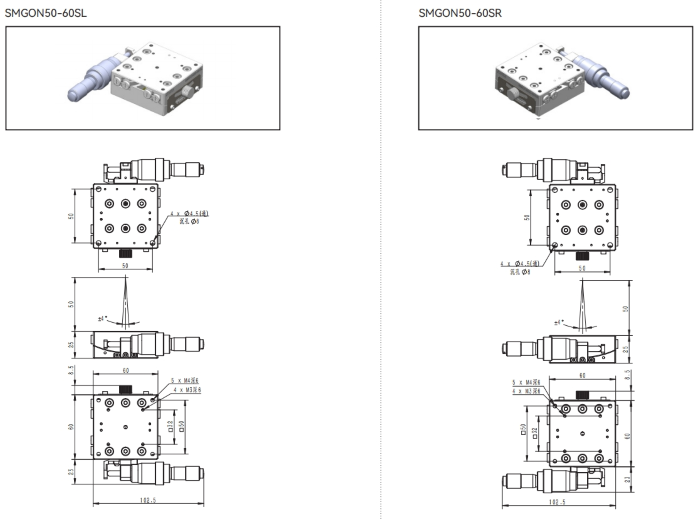 SMGON 系列产品是卓立汉光开发的手动摆动滑台,该系列产品主体材料 采用优质不锈钢,使用弧形 V 型导轨导向,差动分厘卡驱动的手动摆动滑台。 台面运行平稳可靠,灵敏度高。台面多种标准孔位的安装孔适合不同需要,下 方标准固定孔方便将其与其他滑台连接,组成多维滑台。