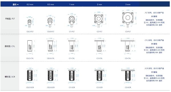 提供平板、圆柱和螺柱三种探头形式,量程覆盖范围 0.2 mm, 0.5 mm, 1mm, 2mm & 3mm,并提供高真空.HV, 超高真空.UHV 和完全无磁材料.NM 的多版本选择。
