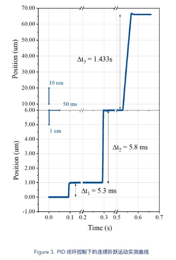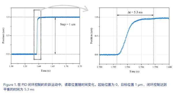 运动闭环控制策略如 Figure 2 所示。系统可在 5.3 ms 内实现启动、加速、匀速、减速和停止五个运动过程,并完成 1 !m 的平滑阶跃,且无过冲现象。 Faraday.03 每 20 !s 进行一次位置更新,为 PID 动态控制提供了关键支持。