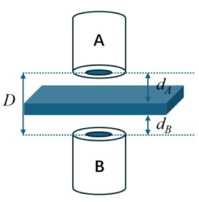 测量原理:在被测导体两侧相对安装两只传感器( Sensor A 和 Sensor B),其端面之间的距离 D 固定。 厚度的计算公式为 Thickness= D - (dA + dB),其中 dA 和 dB 分别为两只传感器所测到的金属表面距离的精确读数。