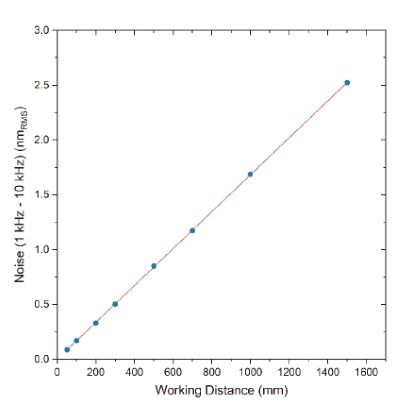 图 1:不同工作距离下,在频率范围(1 kHz 至 10 kHz)内的均方根(RMS)噪声。噪声随工作 距离线性增加,归因于激光相位噪声的贡献。