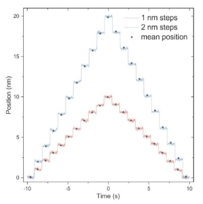 图2:以 1 nm 和 2 nm 步 长 分 别 进 行 的 10 步 往 复测量。测量在距反射器 150 mm 处进行,光学传 感器头精确对准反射器中心。测量带宽为 50 Hz, 每一步的平均位置数据点均通过对该步内所有单 独数据点(共 1000 个)取平均值计算得到。