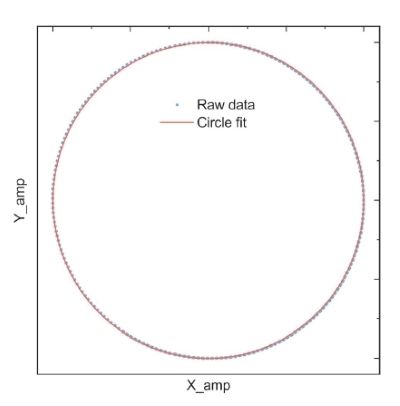 这一性能通过图 3 中的李萨如图形直观地得到了验证, 该图将实际测量数据与理想圆形拟合 进行了对比。